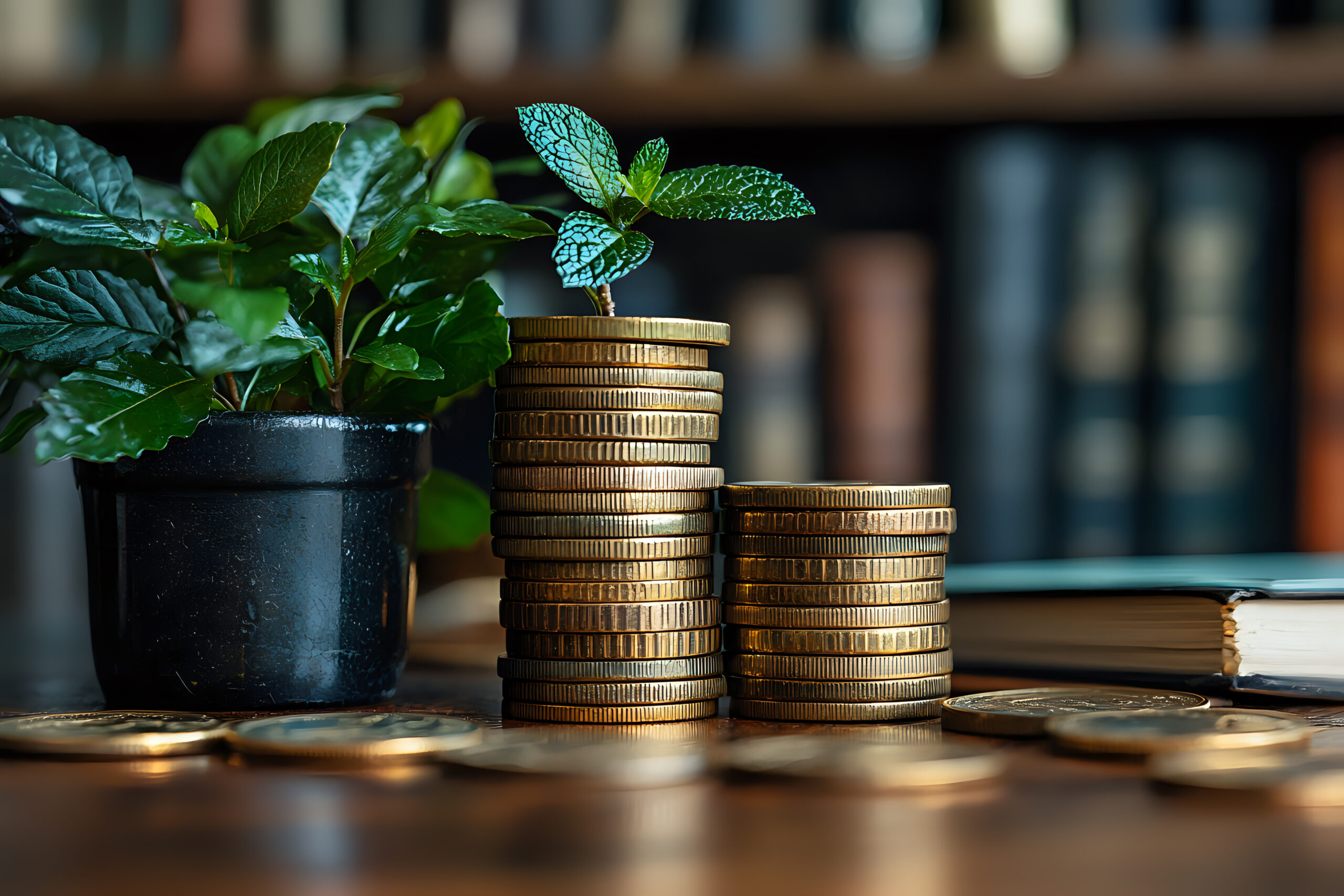 Growing plant next to stacked coins on wooden desk with blurred bookshelf background symbolizes financial growth, investment and sustainable wealth management.