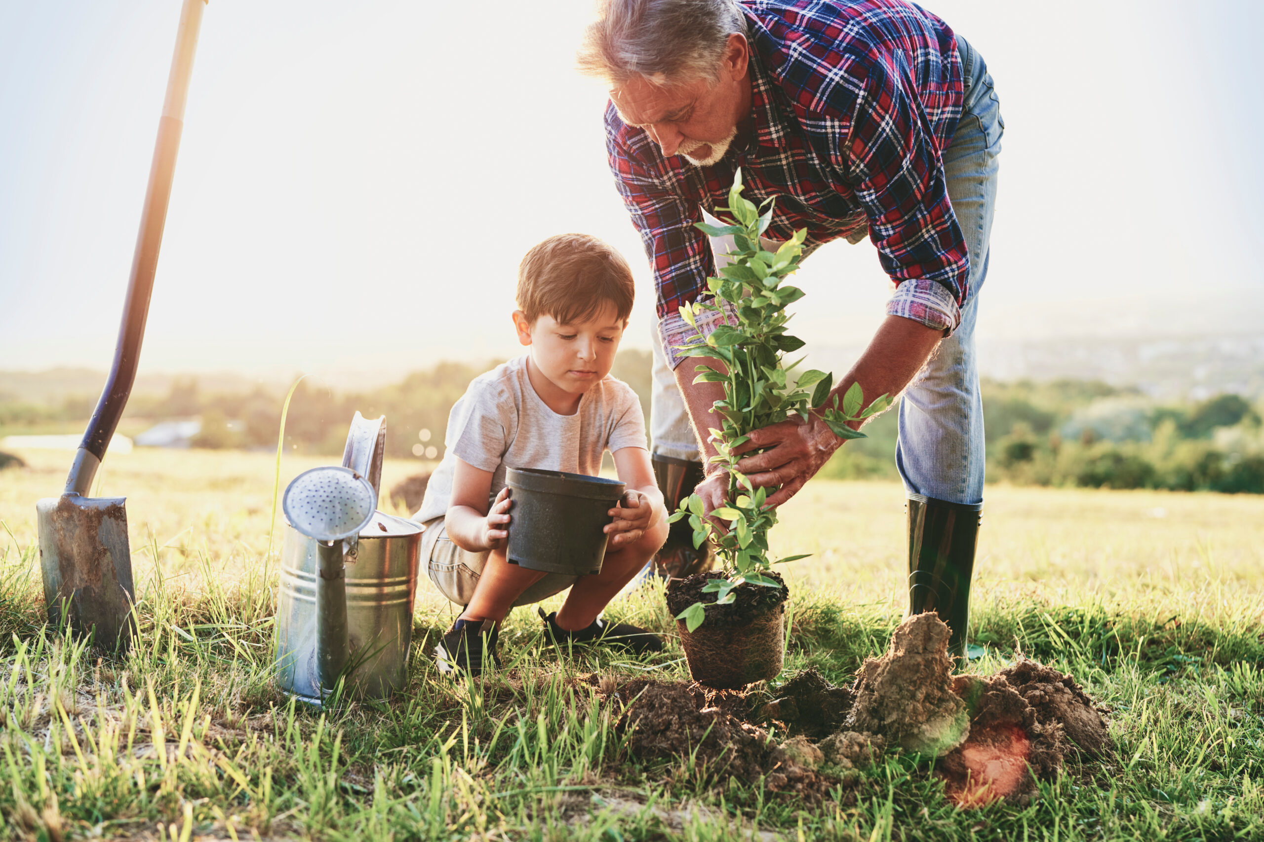 Grandfather and grandson planting a tree